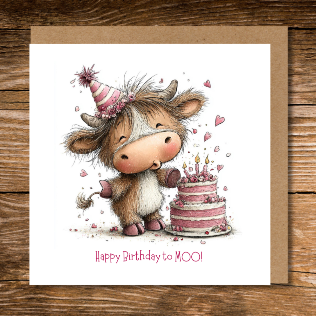 Looking for a funny and adorable birthday card that stands out? This charming Highland cow greeting card features a fluffy baby cow wearing a pink party hat, standing near a cake blowing the candles, alongside the playful caption: “Happy Birthday to MOO!”